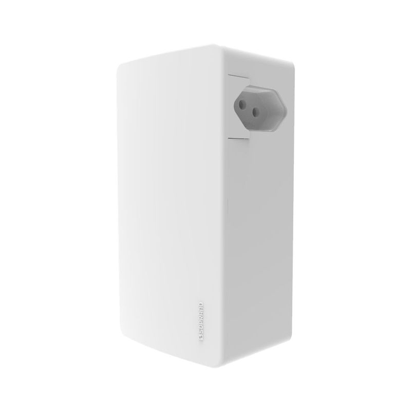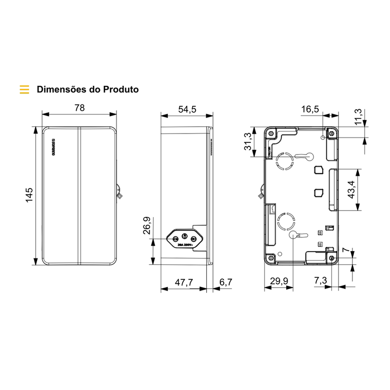 Possui entradas para canaletas e eletrodutos com compatibilidade para aparafusar em caixas de embutir 4x2” e também acabamento brilhante para facilitar a limpeza.