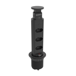 Quando fechada somente a base superior da torre de tomadas fica visível sobre o móvel, ao tocá-la a torre é impulsionada para fora do móvel, após é necessário puxá-la por inteiro e travá-la para iniciar o seu uso.