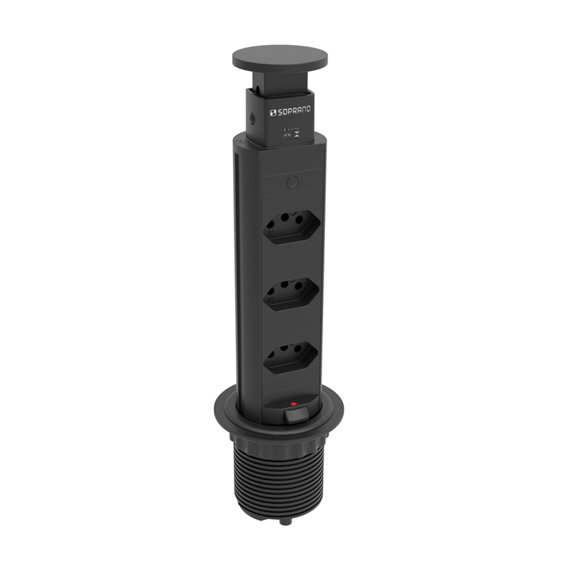 A torre de tomada embutir para móveis da Soprano é instalada em um furo passante de 60mm de diâmetro no móvel, ficando visível somente quando for utilizada.